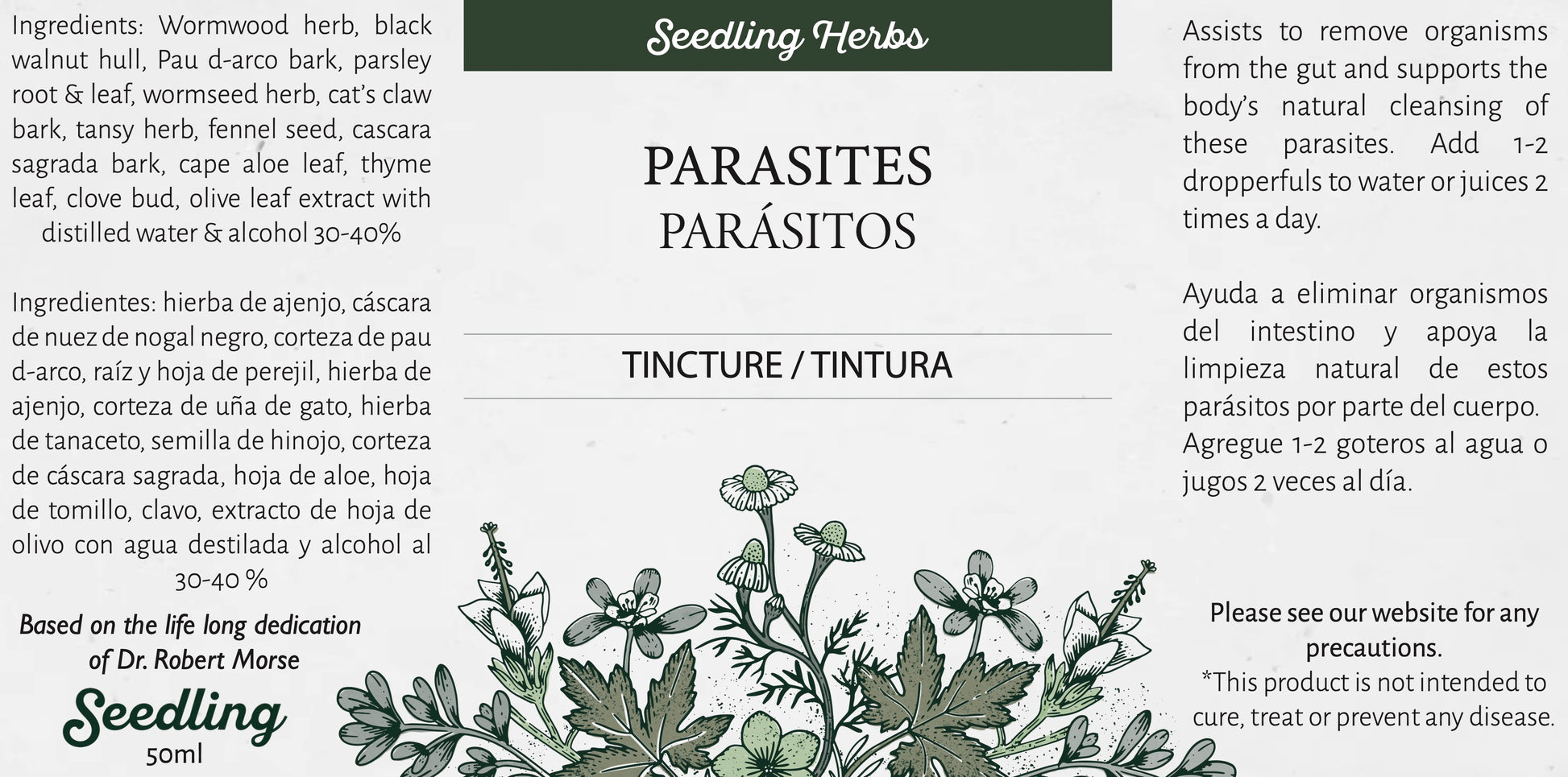 Ingredientes: Hierba de ajenjo, cáscara de nogal negro, corteza de pau d'arco, perejil, hierba de lombriz, corteza de uña de gato, hierba de tanaceto, semillas de hinojo, corteza de cáscara sagrada, hoja de aloe vera, tomillo, clavo de olor, extracto de hoja de olivo con agua destilada y alcohol al 40%, concentración de hierba 1:4.